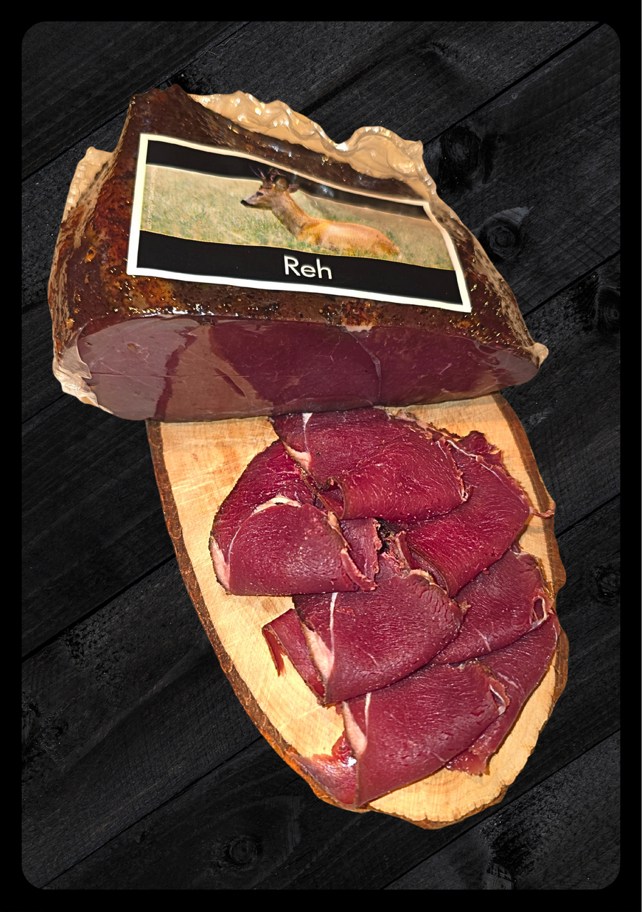 Zutaten: Rehfleisch, Nitritpökelsalz (Meersalz, Konservierungsstoff: Natriumnitrit), Gewürze, Dextrose, Zucker, Gewürzextrakte, Antioxidationsmittel: Natriumascorbat, Rauch